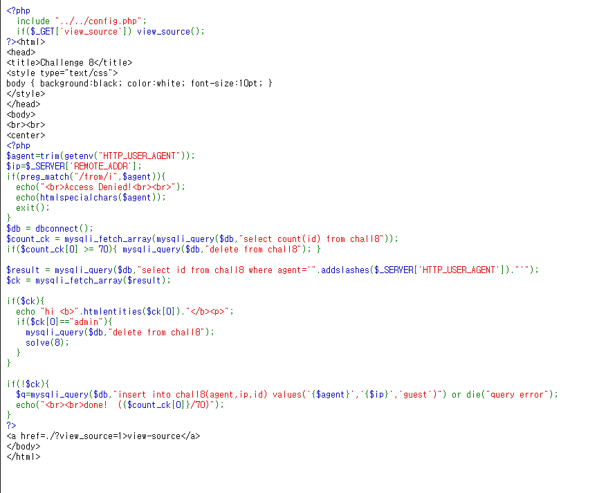 - chall8 테이블에서 addslashes함수를 적용하여 $_SERVER['HTTP_USER_AGENT'] 호출 후 id값을 $ck에 저장