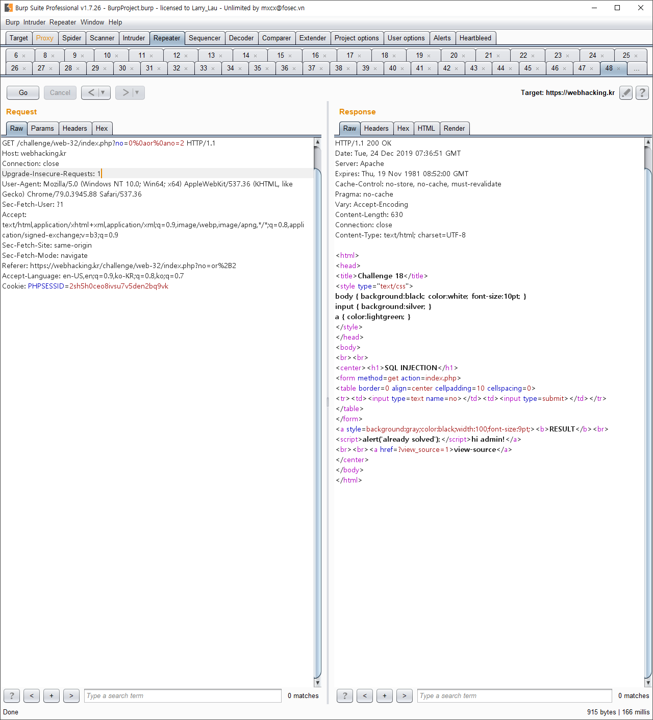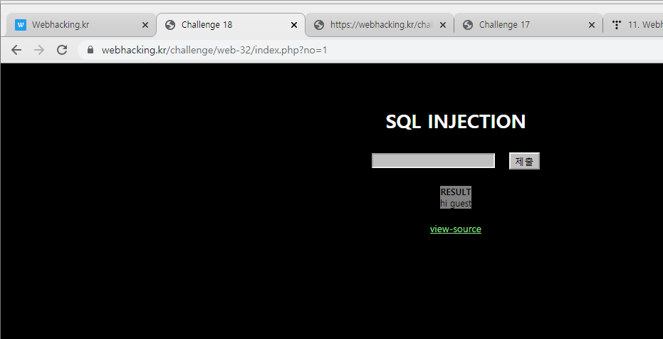 - Payload : select id from chall18 where id='guest' and no=0 or no=2