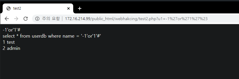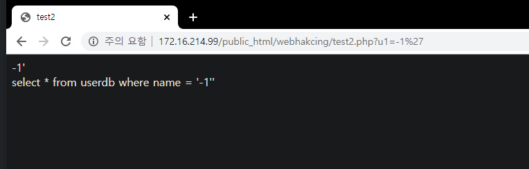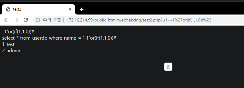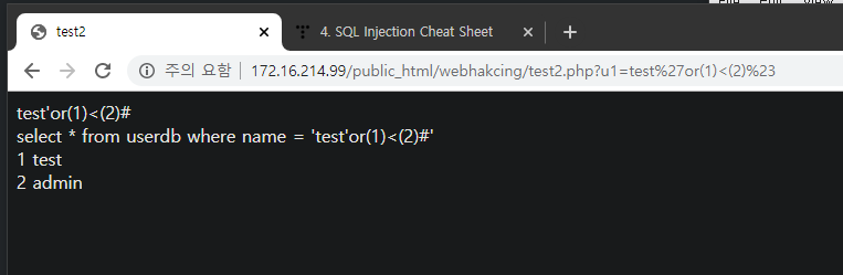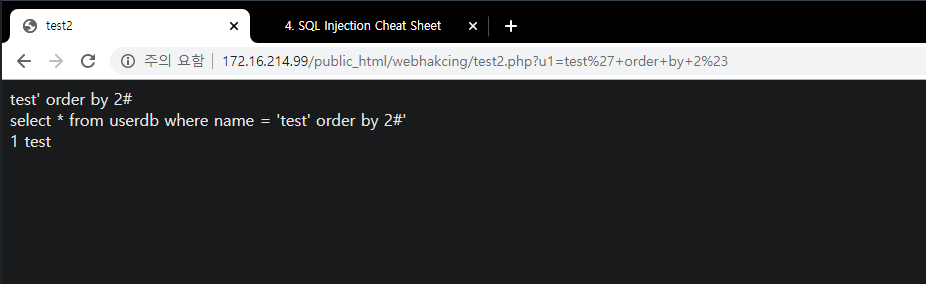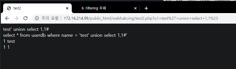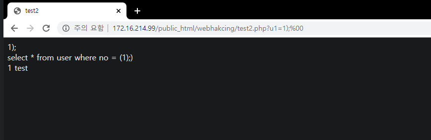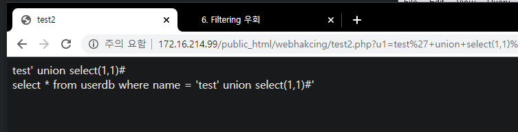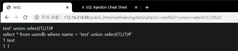 - www.test.com/?no='1 union select sum(no), sum(name),1,1 # -> Data Type Error