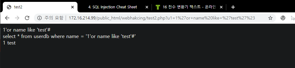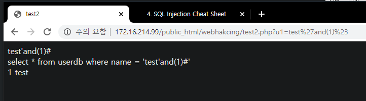- www.test.com/?no=1 and 1=1 -> Result!