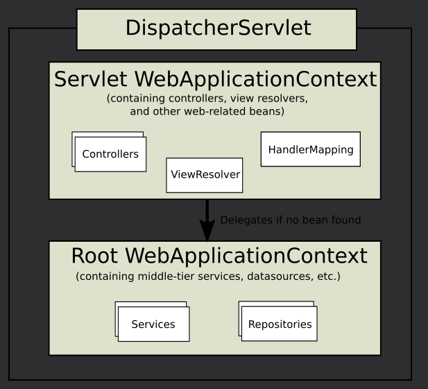 DispatcherServlet에서 만든 WebApplicationContext(Controllers, ViewResolver, HandlerMapping..)는 해당 DispatcherServlet 내에서만 스콥이 설정됨 (다른 서블릿에서는 해당 서블릿을 모른다.) 그래서 Root WebApplicationContext의 경우 웹과 관련되어 있는게 없다. (디스패처 서블릿을 다중으로 사용하지 않을경우 상속 관계를 만들지 않고 디스페처 서블릿에서 빈을 모두 등록하여 사용)