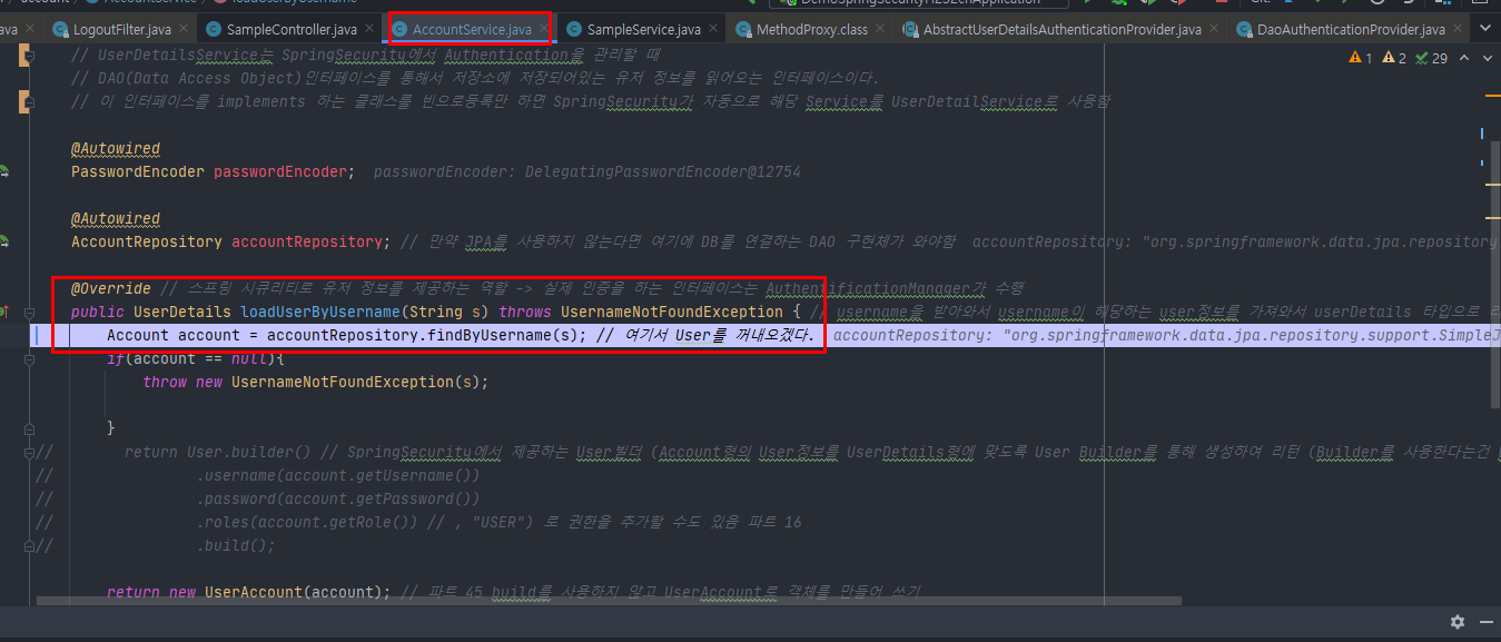 Account account = accountRepository.findByUsername(username); // 여기서 User를 꺼내오겠다.