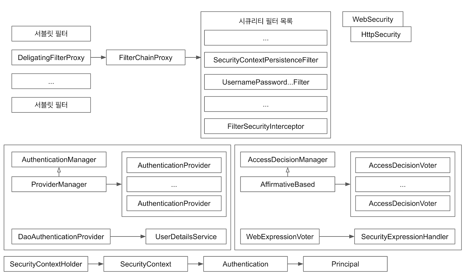 스프링 시큐리티는 "인증"(A 사용자라고 서버에게 알림), "인가"(A 사용자를 확인하여 권한을 부여)와 CSRF, XSS, 세션변조, ClickJacking 등 다양한 웹 보안 관련 이슈에 대응하도록 도와준다.